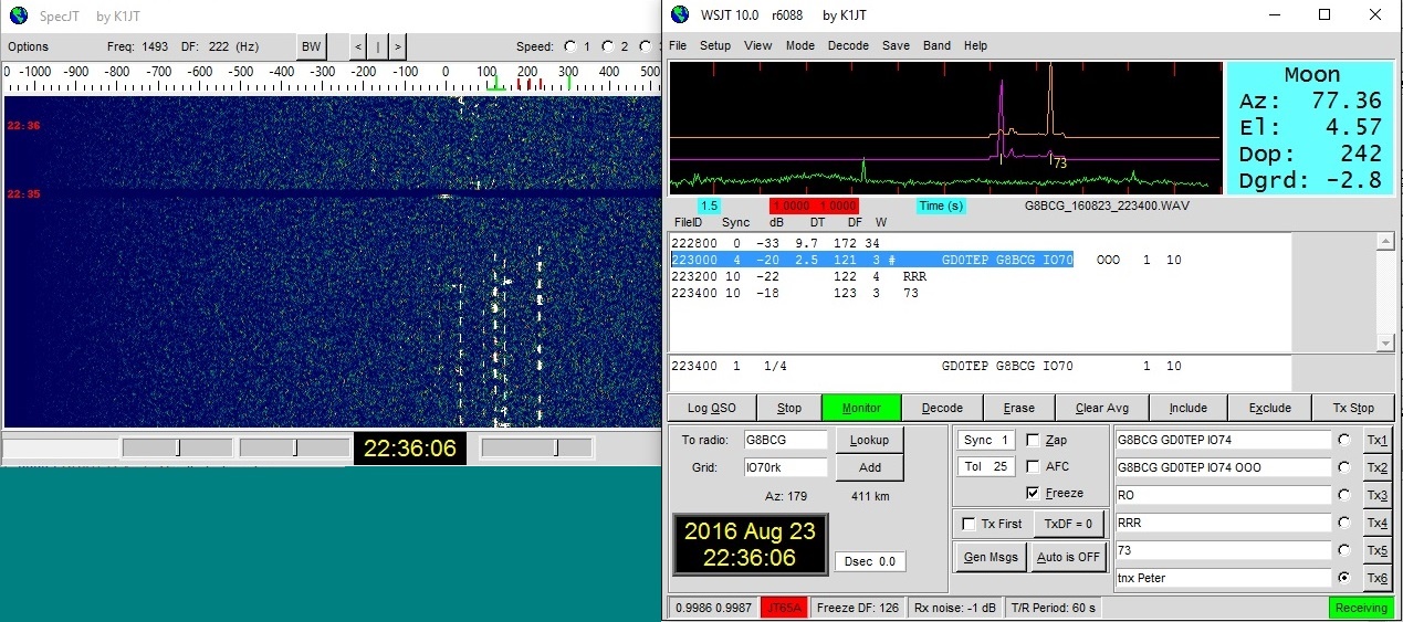 Here's an EME QSO with Peter, G8BCG. Proximity between us meant that we could hear each other direct.
