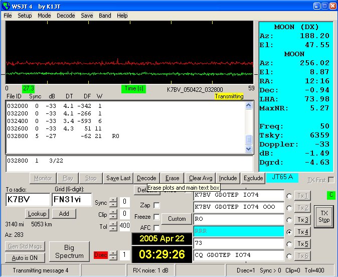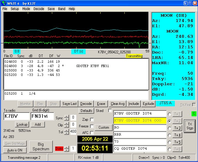 Here's my planned sked for this particular morning with Dennis K7BV. With my moon at +13 degrees, Dennis came through quite quickly with both calls and grid square being copied here. As a result I started sending calls with report of OOO.