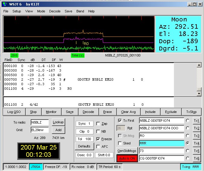At 00:07 i received both sets of callsigns from Mick, and started sending calls/report, as can be seen shown in yellow in the transmit box. Mick heard this and followed with an RO report as shown below:
