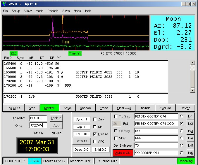 Here's a short EME contact with Gerard, PE1BTX. Although Gerard is a good signal off the moon, the first TX period at 16:58, the decoded text is the direct signal rather than off the moon. The following period I used the TOL and Freeze options and squeezed the band width as narrow as I could. The decoded text at 17:00 is Gerards EME signal, showing the classic 2 & 1/2 seconds time difference, or DT