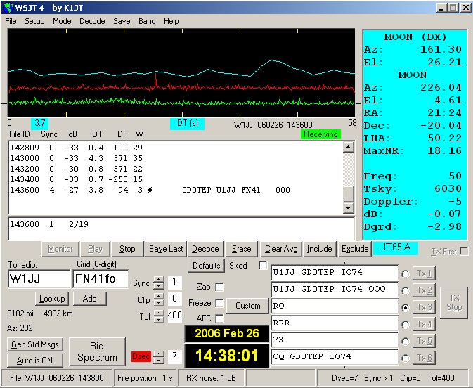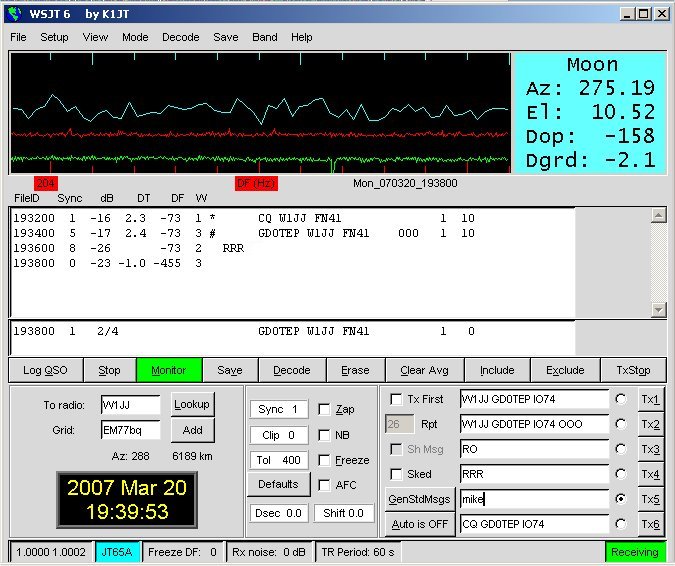 On the 20th of March 2007, and after some antenna repair work my side, i managed to complete again with Mick, W1JJ, the complete QSO didn't take long, just three transmit periods from each station.
