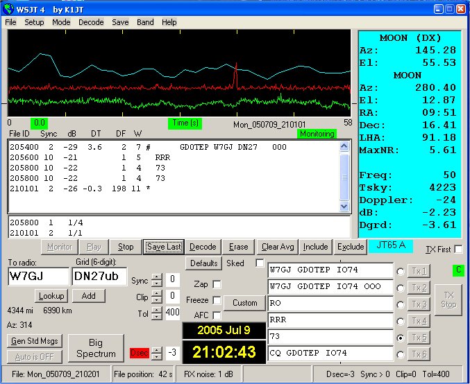 On the weekend of 10th July 2005, VK2BAA was on site for a social 'get together' and a few beers. We were connected to my favourite web site hosted by ON4KST, and I noticed that Lance had logged on. So for a bit of fun, and to show Phil what WSJT was all about, the QSO on the right was set up and completed.