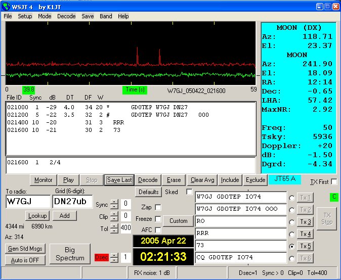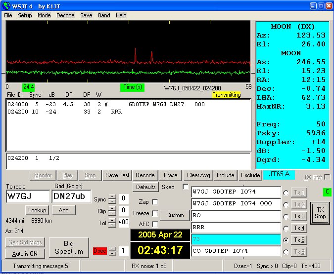 Here is Lance, W7GJ. This was a quick sked that lance and i had to see how high my 3rd lobe is on the 6M11JKV antenna. We started this one with my moon at +20 degrees, and here you can see that the QSO is complete and yet the moon is still at +18 degrees. As i had some time spare prior to an organised sked, lance and i then tried to repeat the QSO, but, this time Lance used a single 6M11JKV his side as well. (see below)